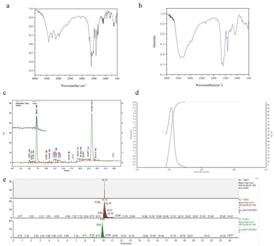 The molecular weight distribution analysis of γ-PGA produced by SDU is shown in Figure 2d and Figure S1. The weight-average molecular weight (MW) off γ-PGA was 1167 kDa (Table S2). The molecular weight (MW) ranged from 771 to 3000 kDa, with a polydispersity (MW/Mn) of 1.05 (Table S3). Under the cultivation conditions used in this study, the molecular weight of γ-PGA produced by B. velezensis SDU was mostly above 1000 kDa (Table S4, Figure 4d). There is no significant variation in the estimated molecular weights between the GPC- and the Mark–Houwink equation-based calculations. The LC-MS analysis of the derivatized products revealed a predominant peak at 10.13 min for the sample, while the retention time ranges for standard D-glutamate and L-glutamate were 10.08–10.19 min (apex at 10.12 min) and 9.83–9.90 min, respectively (Figure 4e).