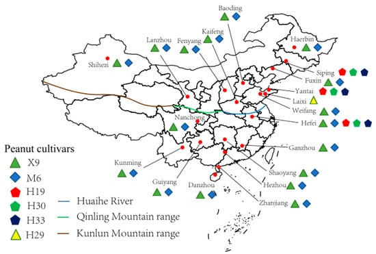 Map of the sampling sites (●) across China. The map was created using R 4.3.2, and the sampling sites were added according to GPS records. Root nodules from the different peanut cultivars in different sites are labeled.