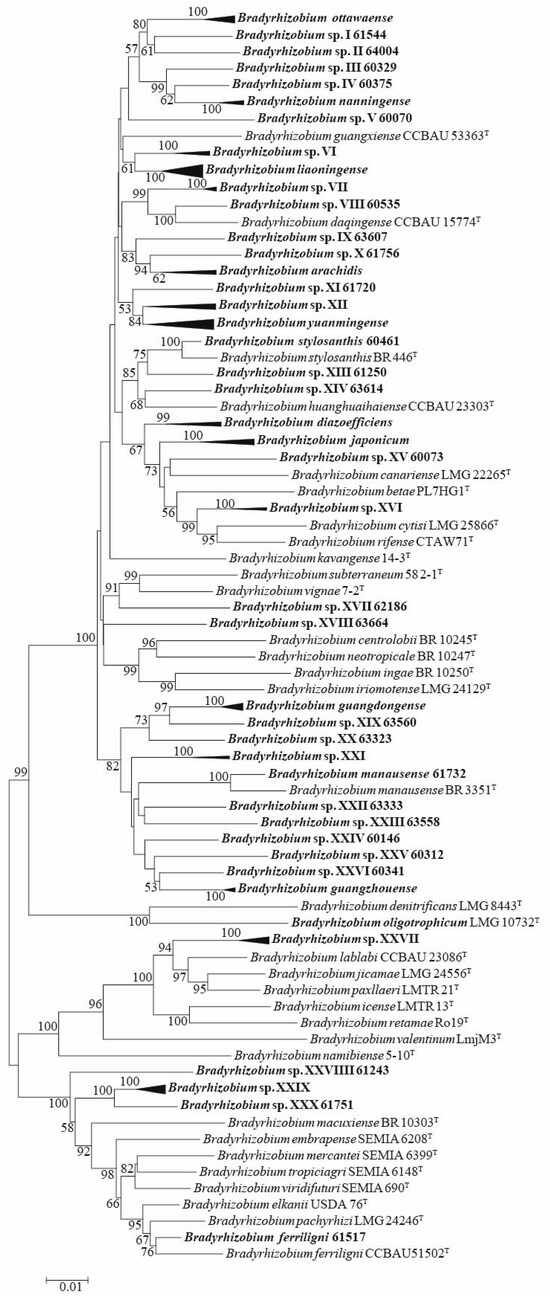 Among the representative strains, five (each representing genospecies with a single isolate) failed in the amplification of symbiotic genes (Table S4), in which Bradyrhizobium sp. XIV 63614 and Bradyrhizobium sp. XVIII 63664 harbored nifH but without nodC, while Bradyrhizobium sp. XIII 61250, Bradyrhizobium sp. XXVI 60341, and Bradyrhizobium sp. XXVIII 61243 failed in amplifying both nodC and nifH. According to the phylogenetic relationships, all the acquired nodC sequences from the remaining representative strains were classified as four clusters (Figure S2). Cluster I comprises 69 representative strains and is intermingled with the type strains for nine defined Bradyrhizobium nodulating with Lespedeza, Glycine max, Vigna, and Arachis. Cluster II is composed of seven representative strains belonging to B. ferriligni and Bradyrhizobium sp. XXIX, which are clustered with B. elkanii IFO 14791T (soybean) and B. ferriligni CCBAU 51502T (Erythrophleum). Cluster III only comprises a single strain corresponding to Bradyrhizobium sp. XXX 61751 that formed an independent lineage. Cluster IV comprises four representative strains belonging to Bradyrhizobium sp. XXVII and is grouped with type strains of six defined species nodulating with LabLab, Phaseolus lunatus, Retama, and Lupinus.