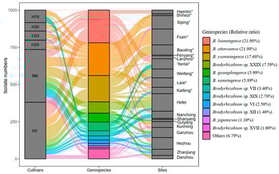 The abundance and distribution of each genospecies isolated in this study. The abscissa shows the cultivar, genospecies, and sampling sites, and the ordinate indicates the isolate number for each cultivar (left), genospecies (middle), or sampling sites (right). The height of each block indicates the isolate numbers. The sampling sites with asterisk * belong to North China, and the rest belong to South China.