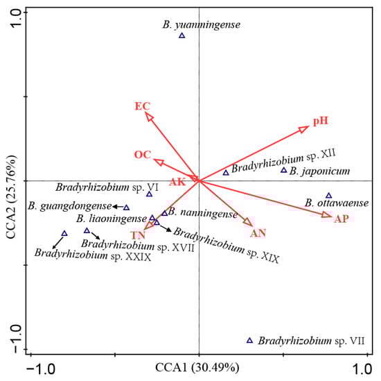 A total of 12 genospecies accounting for more than 1% of total isolates were selected to perform the correlation analyses between soil characteristics and peanut rhizobia by using Canoco 5.0 (Figure 4). A length of 3.6 of the gradient (first axis) was obtained while evaluating the peanut rhizobia community through the detrended correspondence analysis (DCA) program; thus, the canonical correspondence analysis (CCA) was applied to further conduct the data analysis. The first two axes contributed 30.49% and 25.76% of the total variance explanation rate for the species distribution. This result also indicates that soil AP and pH were the main soil factors affecting the distribution of peanut rhizobia in this study, followed by EC, AN, and TN (Figure 4). The statistical analysis also demonstrated that AP and pH were factors with significant (p = 0.026 and 0.018, respectively) effects on the rhizobial distribution, which explains that 12.3% and 10.5% and contributed 22.5% and 19.2% of the total variation (Table S8). In detail (Figure 4), AP was positively correlated with the distribution of B. ottawaense, B. japonicum, and Bradyrhizobium sp. XII, while AN showed similar but minor effects, and EC presented opposite effects compared to AP. The pH positively correlated with Bradyrhizobium sp. XII and B. japonicum but negatively with Bradyrhizobium sp. VI, B. guangdongense, B. liaoningense, B. nanningense, Bradyrhizobium sp. XIX, Bradyrhizobium sp. XVII, and Bradyrhizobium sp. XXIX, while TN showed the opposite effects compared to pH. OC and AK showed minor correlations with the distribution of peanut rhizobial genospecies (Figure 4).