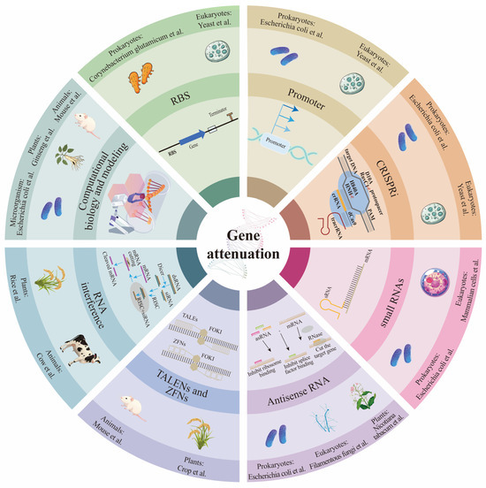 Gene attenuation refers to the partial reduction or modulation of a gene’s expression or function, allowing the gene to retain some activity level while considerably lowering its overall function. This approach does not eliminate the gene’s function but instead “weakens” its effect. Antisense RNA (asRNA), small RNAs (sRNAs), RNA interference (RNAi), CRISPRi, regulatory promoters, and ribosome binding sites (RBS) can enable precise control of target gene expression levels. Transcription Activator-Like Effector Nucleases (TALENs) [34] and ZFNs [35] also contribute to gene expression regulation. Computational biology and modeling can facilitate simultaneous regulation of multiple genes in metabolic pathways to achieve flux optimization. At the same time, the design of regulatory sequences allows for fine-tuning of expression level (Figure 1). Commonly used hosts for gene attenuation include E. coli, Clostridium acetobutylicum, yeast, filamentous fungi, rice, ginseng, Nicotiana tabacum, mouse, cow, and mammalian cells. Computational biology and modeling are frequently applied to microorganisms, animals, and plants. As RNA technology is commonly used in prokaryotes, eukaryotes, and plants; RNAi and TALENs/ZFNs are applied in both animals and plants; SRNAs, promoter optimization, RBS optimization, and CRISPRi are used in both prokaryotes and eukaryotes.