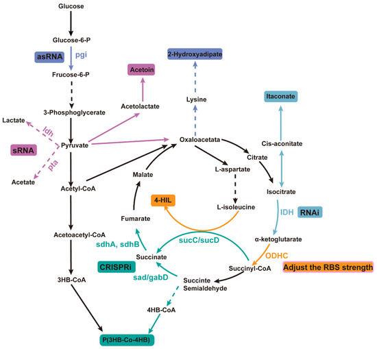 Improving product yield by utilizing different weakening mechanisms in microorganisms. Different colors represent different products using different weakening methods. Automatic design of sRNA was used to downregulate ldh and pta, promoting the synthesis of the metabolite ethyl acetoin; an AsRNA strategy was used to downregulate the expression of glucose-6-phosphate isomerase (encoded by pgi) to promote the production of 2-hydroxyhexanedioic acid; RNAi technology was used to downregulate the expression of NAD⁺-dependent isocitrate dehydrogenase (IDH), thereby increasing the yield of itaconic acid (IA); RBS strength adjustment was used to inhibit the activity of ODHC, leading to an increase in the production of 4-HIL; CRISPRi technology was employed to weaken genes involved in competing pathways to improve the yield of P(3HB-co-4HB). The dotted line arrow indicates that there is a multi-step reaction, and the real line arrow indicates a one-step reaction; the color consistency of the product and the attenuation technology indicates that the product is used to achieve the purpose of gene weakening.