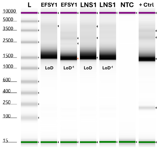 Electronic gel image showing amplicons resulting from a semi-nested PCR using 16S primers for phytoplasmas. Two dilutions (limit of detection (LoD) and LoD−1) of DNA from ‘Candidatus Phytoplasma prunorum’ strains ESFY1 and LNS1 in healthy peach (Prunus persica) DNA and synthetic gBlocks™ positive control (4 fg/µL) were subjected to semi-nested 16S PCR amplification; + Ctrl: 4 fg/µL synthetic control; NTC: no-template control. Amplicons were analyzed using the 4200 TapeStation System, D5000 ScreenTape, D5000 DNA Ladder (L), and D5000 Sample Buffer according to the manufacturer’s instructions. The data show bands of appropriate size (~1500 bp) were produced for all samples tested, as well as the synthetic control; no bands were produced for the NTC.