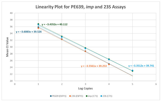 Linear amplification plots for 10-fold serial dilutions of DNA from ‘Candidatus Phytoplasma prunorum’ strain ESFY1 and ‘Ca. P. mali’ strain C71. Strains EFSY1 and C71 were each tested with two assays: PE639 and 23S for ESFY1, and imp and 23S for C71. Data points represent mean Ct values from three independent operators and two instruments (QuantStudio™ 5 Real-Time PCR System and CFX96 OPUS Real-Time PCR System) (N = 12 per data point). Linear regression equations are displayed.