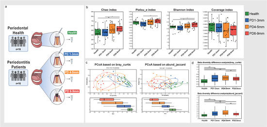 The flowchart of subgingival plaque sample collection and comparison of microbiota alpha and beta diversity among the four groups. (a) The sampling strategies of this study. Subgingival plaque samples collected from periodontal healthy subjects were designated as the health group; subgingival plaque samples collected from periodontitis patients from a probing depth of 0–3 mm, 4–5 mm, and 6–9 mm sites were designated as the PD 0–3 mm group, PD 4–5 mm group, and PD 6–9 mm group, respectively. (b) Microbial alpha diversity as calculated by the Chao, Pielou_e, Shannon, and Coverage index. Comparison among groups were calculated by the Kruskal–Wallis test with FDR (false discovery rate); Welch’s (uncorrected) test was used as a post hoc test. (c) The principal coordinates analysis (PCoA) of beta diversity among the four groups was based on the Bray–Curtis and Abund-Jaccard tests. The ellipses indicate 95% confidence intervals for sample groups. (d) The beta diversity difference analysis based on the Bray–Curtis and Abund-Jaccard tests were calculated by the Wilcoxon rank-sum test with FDR. The y-axis represents the beta diversity distance values. * p ≤ 0.05; ** p ≤ 0.01; *** p ≤ 0.001.