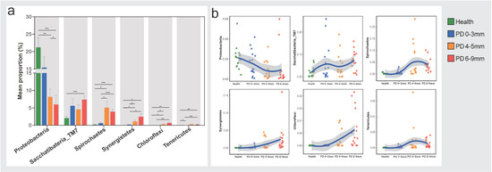 A total of six phyla with significant differences among the four groups were iden-tified, including Proteobacteria, Saccharibacteria (TM7), Spirochaetes, Synergistetes, Chloroflexi, and Tenericutes (Figure 2a). Moreover, relative abundance shift patterns of each phylum across the four groups are shown in separate figures (Figure 2b). The Proteobacteria exhibited a decreasing trend from the health to disease states, with the health group showing significantly higher relative abundance compared to the PD 4–5 mm and PD 6–9 mm groups. In contrast, the relative abundance of the other five phyla, Saccharibacteria (TM7), Spirochaetes, Synergistetes, Chloroflexi, and Tenericutes, ex-hibited increasing trends from the health to disease states.