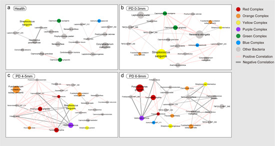 The health group had one yellow complex species (Streptococcus sanguinis), two green complex species (Capnocytophaga gingivalis and Capnocytophaga sputigena), and one blue complex species (Actinomyces naeslundii). Those species were also present in the PD 0–3 mm group; moreover, the orange complex species (Fusobacterium nucleatum subsp. animalis and Fusobacterium nucleatum subsp. vincentii) began to appear in the PD 0–3 mm group. When it comes to diseased sites, the three red complex species (Porphyromonas gingivalis, Tannerella forsythia, and Treponema denticola), with positive correlations among each other, appeared both in the PD 4–5 mm group and the PD 6–9 mm group. In the PD 6–9 mm group, apart from Socransky’s complex, Filifactor alocis and Fretibacterium HMT_360 constructed positive interactions with the three red complex species. Morever, two species belonging to the orange complex (Fusobacterium nucleatum subsp. animalis and Parvimonas micra) and one species belonging to the purple complex (Veillonella parvula) were present in the PD 4–5 mm group and PD 6–9 mm group.