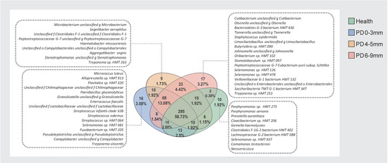 A Venn diagram was used to show the number of species common to or unique among the four groups. In the health, PD 0–3 mm, PD 4–5 mm, and PD 6–9 mm groups, 361, 435, 431, and 438 species were detected, respectively (Figure 5). The number of unique species in each group was 10, 16, 9, and 17, respectively. Among all species detected, 295 species (56.73%) were shared by all four groups, representing the core microbiome of subgingival dental plaque across both health and disease states. Additionally, 68 species were shared by the PD 0–3 mm, PD 4–5 mm, and PD 6–9 mm groups, suggesting they may represent a common microbiome for periodontitis patients. A total of 23 species were shared exclusively by the PD 4–5 mm and PD 6–9 mm groups, which may preferentially inhabit periodontal pockets. Finally, 13 species were shared only between the health and PD 0–3 mm groups. The names of these species are listed in Table S3.