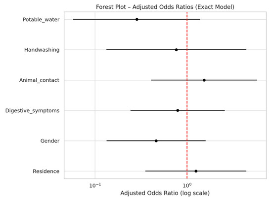 Forest plot for risk factors associated with testing positive samples. The vertical red dashed line in the forest plot represents the null value for the odds ratio (OR = 1.0). An OR of 1 indicates no association between the variable and the outcome. Confidence intervals (CIs) that cross this line suggest that the effect is not statistically significant at the 0.05 level.