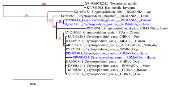 Phylogenetic tree analysis of our isolates illustrates the evolutionary relationships among various Cryptosporidium species and related protozoan parasites confirming their more distant evolutionary relationship. Bootstrap values indicate varying confidence in the branching structure, with the highest support for deeper evolutionary separations. The Cryptosporidium canis isolates from humans in Romania (PP979613.1, PP979610.1) cluster closely together and are more related to C. canis from dogs in Spain and wild dogs in Australia, indicating potential zoonotic transmission. Cryptosporidium parvum isolates from humans in Romania (PQ047137.1, PP979614.1) form a distinct and well-supported clade, separate from C. canis, reinforcing their species-level differentiation. These findings highlight the zoonotic potential and genetic diversity of Cryptosporidium species infecting humans.