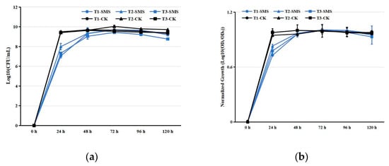 Growth kinetics of PGPR strains in different media. (a) Absolute growth curves (Log10-transformed OD600). (b) Normalized growth profiles (Log10(ODt/OD0)). Notes: T1, T2, T3 represent strain identifiers; SMS: spent mushroom substrate extract; CK: control medium (beef extract peptone). Data represent mean ± SD (n = 3).