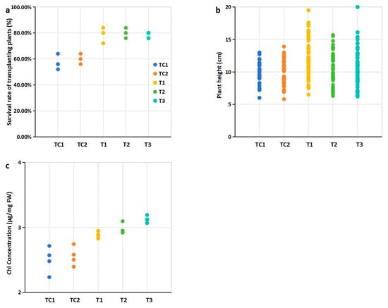 Effects of PGPR inoculation on physiological indices of blueberry plants: (a) Survival rates of transplanted plants after 45 days; (b) Plant height (cm); (c) Chlorophyll concentration (total Chl, mg/g FW, fresh weight). Notes: Survival (%) = (Number of surviving seedlings)/25 × 100 (%). 25 represents the initial number of blueberry seedlings transplanted per pot, and there were three pots for every treatment. Plant height was measured on day 45 for all blueberry seedlings survived. The eighth leaf from four selected seedling with 10 cm height in each treatment was harvested. Note: Dots of the same color represent biological repetitions of the same treatment. The treatment represented by the color of the points in figures b and c is consistent with that in Figure a.