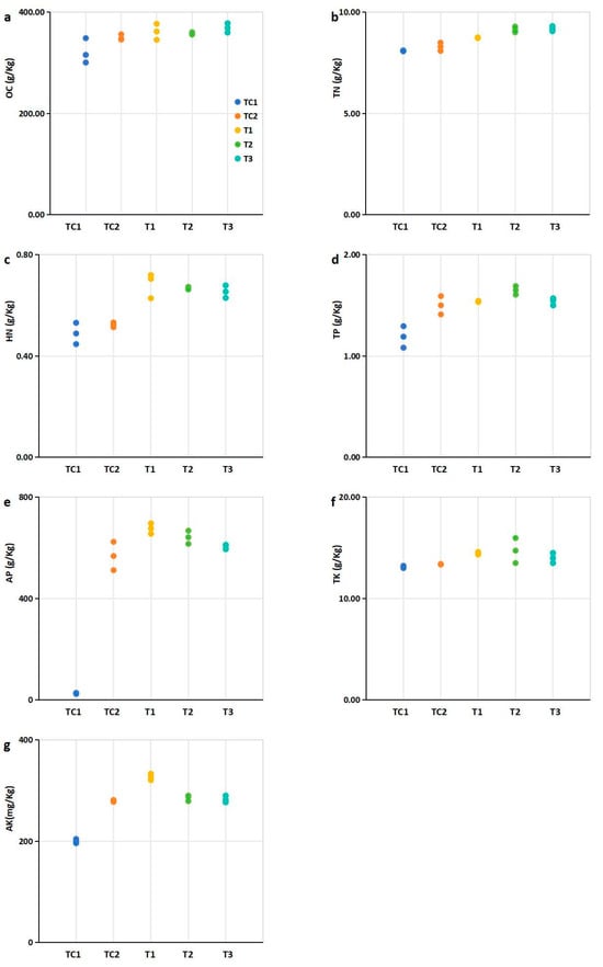 Nutritional element contents in rhizosphere soils of blueberry plants under different treatments. Experimental groups: PGPR-inoculated (T1, T2, T3) Control group: Nutrient soil alone (labeled TC1) and sterilized SMS mixed with nutrient soil at a 1:4 ratio (labeled TC2). (a) Organic carbon (OC). (b) Total nitrogen (TN) contents; (c) Hydrolysable nitrogen (HN); (d) Total phosphorus (TP); (e) available phosphorus (AP); (f) Total potassium (TK); (g) Available potassium (AK). Notes: Data expressed three replicates per treatment. Abbreviations: OC, organic carbon; TN, total nitrogen; HN, hydrolysable nitrogen; TP, total phosphorus; AP, available phosphorus; TK, total potassium; AK, available potassium. Note: Dots of the same color represent biological repetitions of the same treatment. The treatment represented by the color of the points in (b,c) is consistent with that in (a).