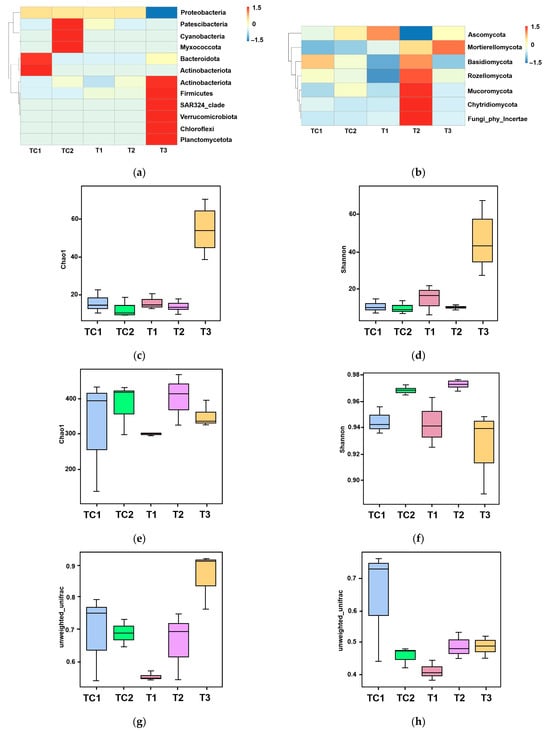 The α-diversity patterns of bacterial and fungal communities were analyzed using Chao1 (species richness) and Shannon (diversity) indices. For bacterial communities (Figure 4c,d), both indices showed progressive declines from T1 to T3, with Chao1 values indicating reduced species richness and Shannon indices (T1: 60; T2: 40; T3: 20) demonstrating parallel decreases in diversity. Fungal communities (Figure 4e,f) exhibited similar trends, with Chao1 values decreasing sharply from T1 (400) to T3 (200), while Shannon indices revealed a consistent diversity reduction across all samples (TC1: 0.98; TC2: 0.96; T1: 0.94; T2: 0.92; T3: 0.90).