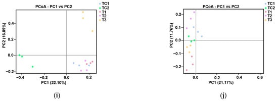 Phylogenetic β-diversity was evaluated using unweighted UniFrac distance metrics (Figure 4g,h), which measure community dissimilarity based on taxa presence/absence patterns. Analysis revealed significant structural differences between control (TC1, TC2) and experimental (T1–T3) groups (Figure 4e,f). The control samples maintained intermediate dissimilarity values (UniFrac range: 0.6–0.7), while experimental samples displayed a progressive decrease in phylogenetic distance from T1 (0.5) to T3 (0.4) (Figure 4g,h).