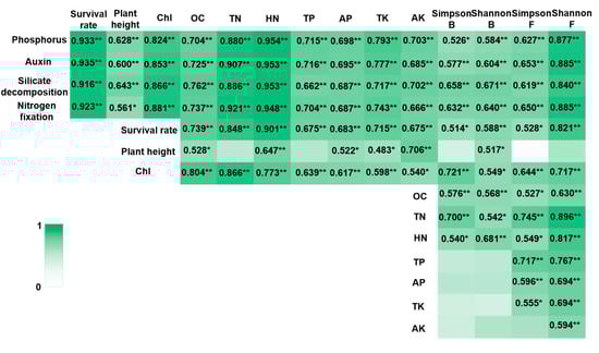 Correlation heatmap integrating PGPR traits, plant growth, soil elements, and rhizosphere microbiota. Note: Chl: total chlorophyll, OC: The organic carbon contents, TN: total nitrogen contents, HN: hydrolysable nitrogen contents, TP: total phosphorous contents, AP: available phosphorous contents, TK: total potassium contents, and AK: available potassium contents. Simpson B and Shannon B were α diversity index of rhizosphere bacteria, and Simpson F and Shannon F were α diversity index of rhizosphere fungi. ** was as significantly associated at 0.01 level (bilateral). * was as significantly associated at 0.05 level (bilateral).