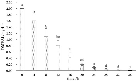 The degradation of DMPAI in the lake–terrestrial ecotone water body is illustrated in Figure 2. The period from 0 to 24 h after the addition of DMPAI was critical for its degradation, during which more than 95% of DMPAI was degraded. The highest slope of the curve was observed between 4 and 8 h, indicating that the degradation rate of DMPAI peaked. After 20 h, the degradation rate of DMPAI slowed significantly (p < 0.01). After 36 h, DMPAI was completely removed from the water column. In the lake–terrestrial ecotone water–soil system, the concentration of DMPAI decreased more rapidly. The concentration of DMPAI in the water is usually no longer detectable after 12 h. This is due to the fact that DMPAI is first adsorbed on the surface of the soil particles and then decomposed by microorganisms. These results suggest that soil microorganisms are the primary drivers of DMPAI degradation. DMPAI is typically adsorbed onto the surface of soil particles and subsequently decomposed by microorganisms. The retention time of DMPAI as an algaecide in the lake–terrestrial ecotone is relatively short, and it does not cause long-term stress to environmental microorganisms.