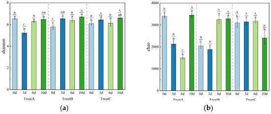 Histogram of change in Chao (a) index and Shannon (b) index of soil bacteria under different concentrations of DMPAI treatments. (Superscript Capital letters (A, B, C) indicate significant differences among time points within the same treatment, while lowercase letters (a, b, c) indicate significant differences among treatments at the same time point. Different letters denote statistically significant differences between groups (p < 0.05), whereas the same letter indicates no significant difference).