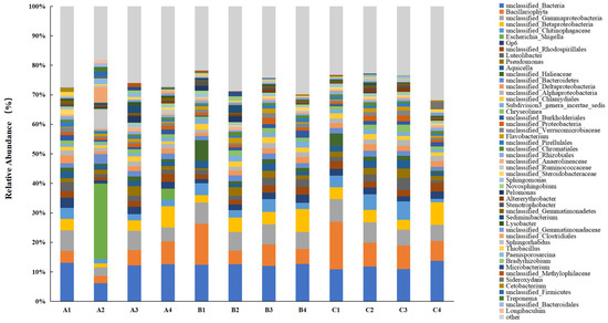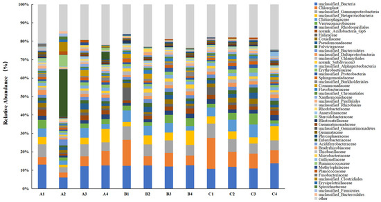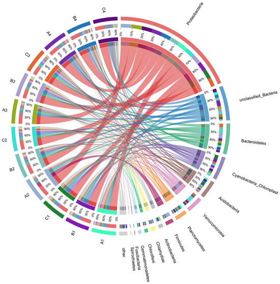 Additionally, algaecide solutions with concentration gradients of 0.01 mg L−1 (treatment A), 0.5 mg L−1 (treatment B), and 2.0 mg L−1 (treatment C) were prepared. A total of 0.01 mg L−1 is generally considered to be the lowest concentration capable of affecting microorganisms. A total of 0.5 mg L−1 and 2.0 mg L−1 are commonly used concentrations for DMPAI as an algaecide [14]. A 300 mL conical flask was filled with 200 mL of DMPAI solution at different concentrations and 50 g of soil from the indoor lake–terrestrial ecotone (Figure 1), to simulate the lake–terrestrial ecotone environment. Bacteria in the sediments were utilized as research subjects to analyze changes in the composition of bacterial communities in the lake–terrestrial ecotone sediments using 16S rRNA high-throughput sequencing on days 0, 3, 6, and 10 of the experiment. The sample collected on day 0 served as the control. The soil samples collected were numbered sequentially from A1, B1, and C1 to A4, B4, and C4.
