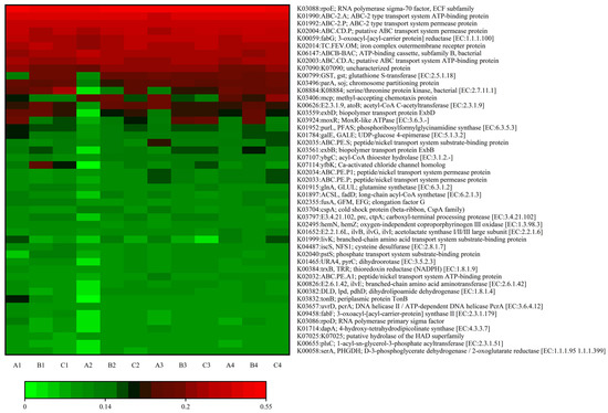 To further elucidate the effects of varying concentrations of algicide on cellular metabolic pathways in the soil bacterial community of the lake–terrestrial ecotone, ortholog groups (KEGG orthology, KO) were used to categorize the molecular functions of genes, and the KEGG pathway database was employed to assess changes in metabolic pathways. As shown in Figure 7, the relative abundance of K08884 (serine/threonine protein kinase, bacterial [EC:2.7.11.1]), K07114 (Ca-activated chloride channel homolog), and K03406 (the methyl-tolerant chemotaxis protein) exhibited significant variations following the introduction of DMPAI into the lake–terrestrial ecotone environment. K03406 encodes a gene that assists microorganisms in mitigating the toxicity of environmental pollutants, including heavy metals. The relative abundance of K03406 showed a significant increase across treatments during the experiment, with the effect being more pronounced in treatment C, which contained a high concentration of DMPAI. Studies have shown that the K03406 gene, encoding a methyl-receptor chemotactic protein, is associated with the two-component-system metabolic pathway. This pathway, present in a wide range of Gram-negative bacteria, is essential for various bacterial life activities and represents a key mechanism through which bacteria sense environmental changes and develop corresponding regulatory strategies [34]. The increase in the relative abundance of K03406 indicates changes in the proportion of Gram-negative bacteria in the bacterial community.