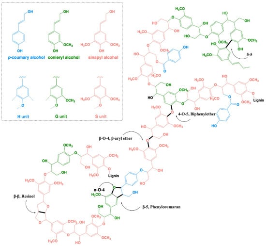 The complex aromatic polymer is synthesized in plants mainly from three basic building blocks: p-coumaryl alcohol, coniferyl alcohol, and sinapyl alcohol. Consequently, the complex heterogenic polymeric lignin network mainly consists of three recognizable basic units: p-hydroxyphenyl (H), guaiacyl (G), and syringyl (S) moieties [5]. Gymnosperms (softwood, i.e., conifer, pine, cedar, spruce, etc.) mostly contain guaiacyl-based lignin (G), whereas dicotyledonous plants (legumes, beans, sunflower, tomato, etc.) mainly contain guaiacyl-syringyl-based lilac lignin (G-S), and monocotyledonous plants (maize, wheat, rice, cane, etc.) mainly contain guaiacyl-syringyl-hydroxyphenyl-based lilac lignin (G-S-H) [6] (Figure 1). Lignin polymerization in plants occurs via the formation of oxidative radicals of these structural units, followed by combinatorial radical coupling [7]. Among the variety of linkages, the β-O-4 bond is the most prominent one (40–50%), followed by β-β, β-5, 5-5, 5-O-4, and α-O-4 linkages [8,9,10,11] (for details, see Figure 1).