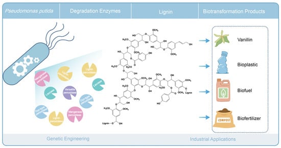 Efficient utilization of lignin, a complex polymer in plant cell walls, is one of the key strategies for developing a green and sustainable bioeconomy. However, bioconversion of lignin poses a significant challenge due to its recalcitrant nature. Microorganisms, particularly fungi and bacteria, play a crucial role in lignin biodegradation, using various enzymatic pathways. Among bacteria, Pseudomonas putida is considered a promising host for lignin degradation and valorization, due to its robust and flexible metabolism and its tolerance to many noxious and toxic compounds. This review explores the various mechanisms of lignin breakdown by microorganisms, with a focus on P. putida’s metabolic versatility and genetic engineering potential. By leveraging advanced genetic tools and metabolic pathway optimization, P. putida can be engineered to efficiently convert lignin into valuable bioproducts, offering sustainable solutions for lignin valorization in industrial applications.