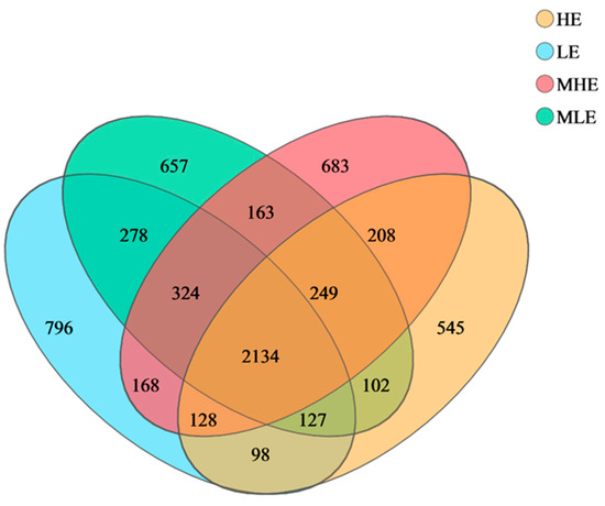 Veen diagrams of OTUs in the feces of goats when consuming a lower-protein diet with varying energy levels. LE, low metabolizable energy (=7.01 MJ/kg DM) group; MLE, middle–low metabolizable energy (=8.33 MJ/kg DM) group; MHE, middle–high metabolizable energy (=9.66 MJ/kg DM) group; HE, high metabolizable energy (=10.98 MJ/kg DM) group. n = 8 samples per group.