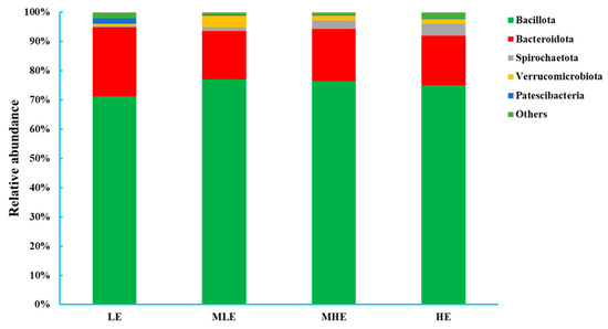 Relative abundances of bacterial phyla (>0.50% of total reads) in the feces of goats when consuming a lower-protein diet with varying energy levels. LE, low metabolizable energy (=7.01 MJ/kg DM) group; MLE, middle–low metabolizable energy (=8.33 MJ/kg DM) group; MHE, middle–high metabolizable energy (=9.66 MJ/kg DM) group; HE, high metabolizable energy (=10.98 MJ/kg DM) group. n = 8 samples per group.