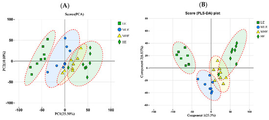 The principal component analysis (PCA) showed that LE, MLE, MHE, and HE groups could be distinguished, indicating that different treatments change the metabolite diversity of the feces of goats as a whole (Figure 5A). However, the partial least squares discriminant analysis (PLS-DA) model showed significant differences among the four groups (Figure 5B).
