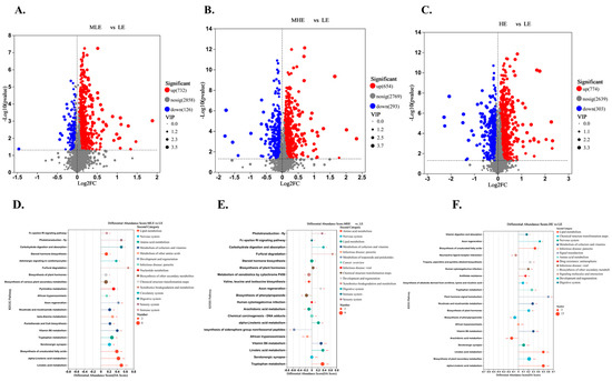 The results of the volcano plot analysis showed that the fecal metabolites of the MLE, MHE, and HE groups compared to the LE group were quite different. The total number of differential metabolites between MLE and LE groups was 858, of which 732 were upregulated, and 126 were down-regulated (Figure 6A). The total number of differential metabolites between MHE and LE groups was 947, of which 654 were upregulated, and 293 were down-regulated (Figure 6B). The total number of differential metabolites between HE and LE groups was 1007, of which 774 were upregulated, and 303 were down-regulated (Figure 6C).