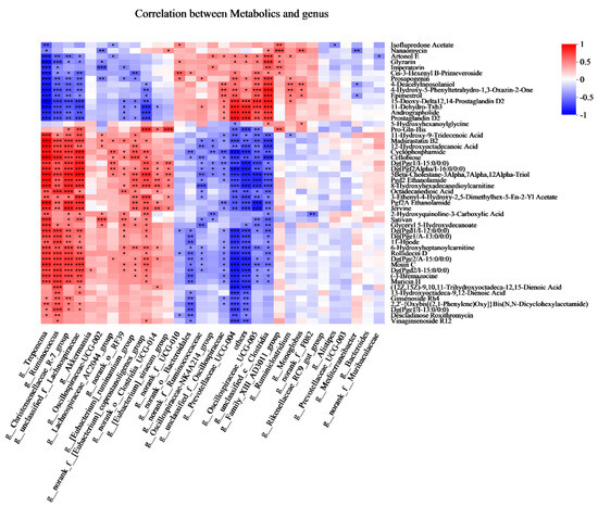 Correlations analysis between the fecal bacteria (at genus) and fecal metabolites (Top 50) based on Pearson’s rank correlation analysis. * p < 0.05, ** p < 0.01, and *** p < 0.001 according to Pearson’s rank correlation coefficient.