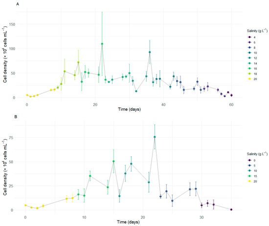 At a salinity of 12 g L−1, a less pronounced initial reduction in density was observed, followed by a significant increase over time, resulting in a second peak at the end of this stage, with an average of 92.75 × 104 cells mL−1. Upon reduction to 10 g L−1, another sharp decline in cell density was observed, which remained stable until the transition to a salinity of 6 g L−1. From this point onward, density began to gradually decrease until reaching a salinity of 2 g L−1, where no cells were observed in suspension at the end of the experiment on day 60 (Figure 1A).