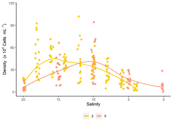 Correlation between cell density and salinity for the different salinity reduction strategies (S2 and S5) for the dinoflagellate Durusdinium glynnii.