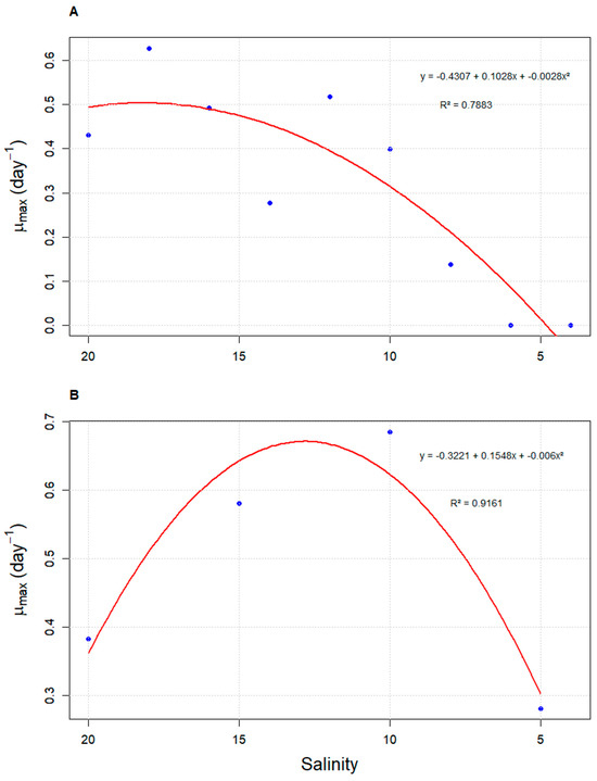 The analysis of the density curve as a function of salinity revealed that strategy S2 achieves higher densities in a shorter time compared to strategy S5. However, both curves exhibit an intersection point at a salinity of 12 g L−1. Beyond this point, the density in strategy S2 gradually decreases, falling below the values observed for S5. On the other hand, strategy S5 reaches its highest density at a salinity of 10 g L−1, before the cell density begins to decrease (Figure 2). These results are consistent with the quadratic regression performed between density and salinity, where the vertex of the parabola passes through the salinity of 12 g L−1. Similar to what was observed for cell density, μmax values also varied according to salinity under both evaluated strategies. In strategy S2, the highest values were recorded at higher salinities (18 g L−1; μmax = 0.627 ± 0.13 day−1), with a sharp decline as salinity decreased. In contrast, strategy S5 showed its peak μmax at 10 g L−1 (μmax = 0.685 ± 0.02 day−1). Both strategies fitted significantly to quadratic models, with coefficients of determination (R2) of 0.7883 and 0.9161 for S2 and S5, respectively (Figure 3).