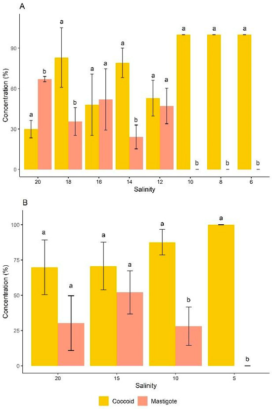 In the classification of cell morphotypes of D. glynnii, strategy S2 exhibited both coccoid cells and mastigotes at salinities ranging from 20 to 12 g L−1. Initially, the cells were predominantly mastigotes (approximately 70% of the total population), and as the dilutions progressed, coccoid cells became more prominent. At a salinity of 10 g L−1, mastigotes were no longer present, and the population consisted exclusively of coccoid cells, reaching 100% of this morphotype at salinities equal to or below 10 g L−1. In strategy S2, all salinities showed statistically significant differences between coccoid and mastigote cell morphotypes, with the exception of salinities 16 and 12 g L−1, where no significant differences between these two morphotypes were observed (Figure 4A).