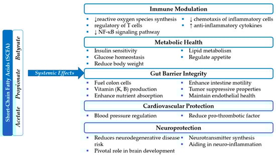 Fermentation of complex polysaccharides, such as dietary fibers, which human enzymes cannot digest, is one of the primary functions of gut microbes [10]. SCFAs such as butyrate, propionate, and acetate are produced in the large intestine and play a critical role in metabolic homeostasis. These compounds serve as primary energy sources for colonocytes, regulate intestinal motility, protect the intestinal mucosal layer, improve nutrient absorption, and modulate systemic inflammatory responses, Figure 1 [10,11,12]. Butyrate, produced by bacteria such as Faecalibacterium prausnitzii, Eubacterium rectale, and Roseburia spp., has been shown to have anti-inflammatory and antitumor properties, contributing to the maintenance of intestinal mucosal health and reducing the risk of conditions such as leaky gut syndrome [12,13]. Additionally, studies indicate that butyrate stimulates the production of mucin and antimicrobial peptides, which protect the intestinal mucosa from infectious agents [12]. The degradation of glycoproteins in the intestinal mucus, carried out by bacteria such as Akkermansia muciniphila, Bacteroides fragilis, and Ruminococcus gnavus, provides essential nutrients for the gut microbiota and contributes to maintaining the integrity of the intestinal barrier [14,15,16].