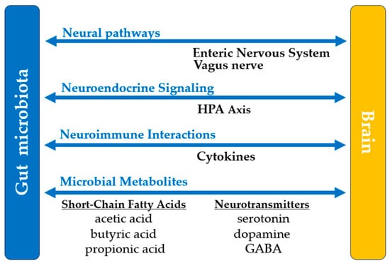 The vagus nerve represents the primary communication pathway between the gut microbiota and the brain. Its intestinal receptors are indirectly stimulated by chemical substances produced by the microbiota, such as SCFAs, neurotransmitters, intestinal hormones [cholecystokinin and peptide YY(YY)], and mechanical stimuli (changes in pressure and intestinal wall distension) [100,101]. Many of these signals are mediated by enteroendocrine cells, which release signaling molecules that activate the afferent fibers of the vagus nerve. Microbial metabolites, such as SCFAs, are vital for optimal CNS functioning. SCFAs, such as acetate and butyrate, are pivotal in brain development, neurotransmitter synthesis, and neuroinflammation [100]. The gastrointestinal microbiota directly produces or regulates the production of neurotransmitters such as serotonin, dopamine, and gamma-aminobutyric acid (GABA).