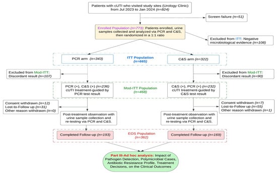- Spangler, F.L.; Williams, C.; Aberger, M.E.; Wilson, B.A.; Ajib, K.; Gholami, S.S.; Goodwin, H.N.; Park, L.Y.; Kardjadj, M.; Derrick, D.; et al. Clinical utility of PCR compared to conventional culture and sensitivity testing for the management of complicated urinary tract infections in adults: Part I. Assessment of clinical outcomes, investigator satisfaction scores, and turnaround times. Diagn. Microbiol. Infect. Dis. 2025, 111, 116601. [Google Scholar] [CrossRef] [PubMed]