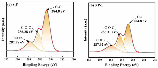 To analyze the effect of vanadium stress on the extracellular polymer (EPS) fractions of S.P-1, the EPS powders were subjected to full-spectrum and high-resolution scans of C 1s, N 1s, O 1s, P 2p, and S 2p using a ThermoScientific K-Alpha XPS instrument (ThermoScientific, Waltham, MA, USA), and the peak areas were deconvolved and analyzed semi-quantitatively by Avantage software 6.0. As shown in the Figure 9, the C1s peaks of both S.P and S.P-1 are decomposed into three different peaks, each with a different peak area, indicating that their contents are different. The three peaks of the S.P are C-(C,H) (284.8 eV), C-(O, N) (286.28 eV), and C = O or O-C-O (287.78 eV). The three peaks for the S.P-1 are C-(C, H) (284.8 eV), C-(O, N) (286.31 eV), and C=O or O-C-O (287.92 eV). C-(C, H) comes mainly from a large portion of the side chains of polysaccharide lipids or amino acids. C-(O, N) comes mainly from alcohols, amines, or ether amides and C=O or O-C-O from carboxylates, carbonyls, and amides [38]. After comparing the changes in functional group content before and after domestication, C-(C, H) increased from 2.77% to 33.59%, C-(O, N) increased from 1.83% to 17.25%, and C=O or O-C-O increased from 1.68% to 19.62% after domestication. Carbon–nitrogen bonds and amide groups of the class are often found in proteins [39], and O-C-O is an important functional group in polysaccharides. These results suggest that domestication plays an important role in the changes of polysaccharides and proteins on the surface of bacteria. It has been reported that exogenous stress stimulates the strain to secrete more proteins and other substances for its own protection and nutritional replenishment [40].
