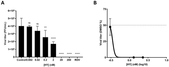 Vero E6 cells were seeded 24 h before the experiment. HY was used in final concentrations of 0.002–200 nM. For the infection assay, culture media was removed from the cells’ monolayers, followed by washing them with PBS (Gibco, Waltham, MA, USA). A multiplicity of infection (MOI) of 0.01 was used for infection, which was performed for 1 h in the incubator. The plates were gently agitated every 10 min to facilitate viral adsorption. After that, the inocula were removed, and HY was added. Cell supernatants were collected 48 hpi and stored at −80 °C for subsequent viral titration. A concentration-response curve was generated, and the concentration required to inhibit viral replication by 50% (IC50) was determined through nonlinear regression using GraphPad Prism (Version 8).