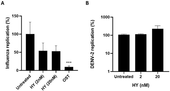 To evaluate whether HY exerts a broader antiviral effect, we tested its activity against two other RNA viruses: influenza A(H1N1)pdm09 subtype and DENV-2. The two concentrations of HY (2 and 20 nM) were selected based on their significant antiviral activity against SARS-CoV-2 to evaluate potential broad-spectrum antiviral properties. Different timepoints for viral quantification (24 h for Influenza A versus 48 h for DENV-2) were chosen to capture the optimal window for viral replication in each virus model. In viral replication inhibition assays, treatment with HY (2 and 20 nM) did not significantly reduce viral RNA levels in comparison to untreated controls (Figure 2). While influenza-infected cells showed an average reduction of approximately 50% in viral RNA at HY concentrations tested, the difference was not statistically significant. No inhibitory effect was observed for DENV-2. These results suggest that the antiviral effect of HY may be specific to SARS-CoV-2.