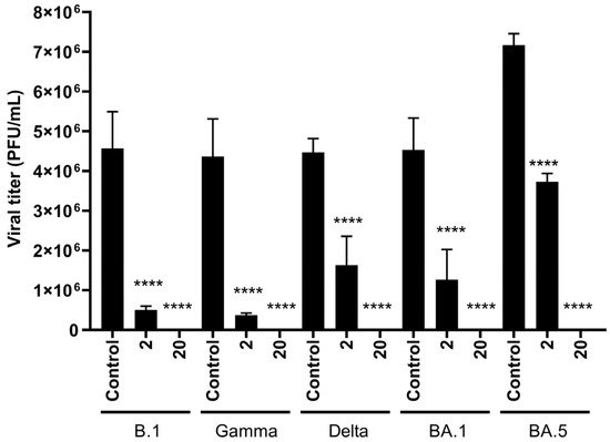 To evaluate the impact of post-infection treatment with HY on the replication of SARS-CoV-2 variants, including B.1, gamma, delta, and omicron (BA.1 and BA.5), we conducted an assay in infected cells, as previously described. HY was employed at concentrations of 20 nM and 200 nM for post-infection treatment over 48 h. All procedures related to cell infection and the final steps of viral suspension collection, titration, and statistical analysis were conducted using the same protocols previously mentioned.
