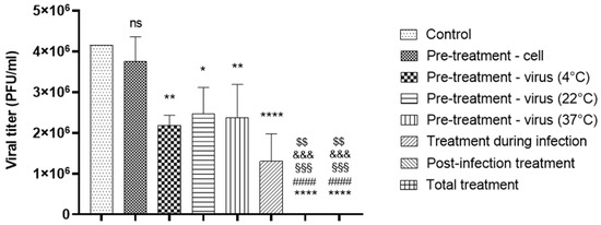 To provide a comprehensive comparison across all treatment conditions, we conducted statistical analyses among the different groups (Figure 4). Total treatment resulted in significantly lower viral titers compared to pre-treatment of cells (mean titer: undetectable vs. 3.7 × 106 PFU/mL; p < 0.0001) and virus pre-incubation at 4 °C, 22 °C, and 37 °C (mean titers: 2.2 × 106, 2.5 × 106, and 2.4 × 106 PFU/mL, respectively; p = 0.0012, p = 0.0003, and p = 0.0005). No significant difference was observed between total and post-infection treatment (both with undetectable titers, p > 0.9999), nor between total and during-infection treatment (mean titer: undetectable vs. 1.3 × 106 PFU/mL; p = 0.0801).