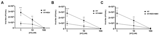Additionally, the combination of HY (1 nM and 10 nM) with NMV (4 µM) also resulted in a statistically significant reduction in viral titers, in comparison with HY monotherapy (mean titer: 9.7 × 105 PFU/mL vs. 2.8 × 106 PFU/mL and 5.0 × 105 PFU/mL vs. 1.5 × 106 PFU/mL, respectively; p < 0.0001 and p < 0.01, respectively), with an incremental reduction of 65.88% and 66.66% compared to HY monotherapy. As observed with RDV, the combination of HY at 100 nM with NMV did not enhance the antiviral effect beyond what was already achieved by HY alone at this concentration (mean titer: 6.6 × 104 PFU/mL vs. 3.3 × 104 PFU/mL) (Figure 5B). It is important to mention that treatment with NMV alone (4 µM) showed titers of 1.4 × 106 PFU/mL.