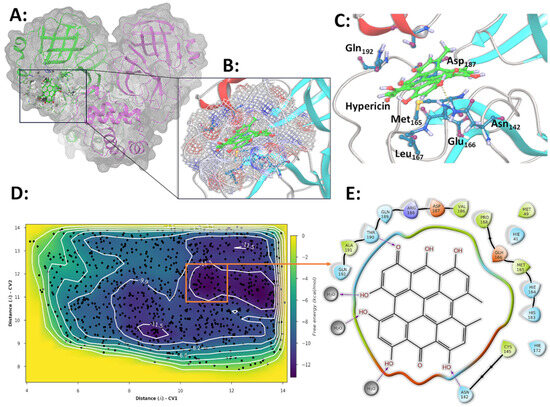 Representation of important SARS-CoV-2 3CLpro contacts with HY, obtained in simulation and metadynamics experiments. (A) General view of the 3CLpro-HY complex. The protein contact surface is represented in blue for positive and red for negative electrostatic. HYinhibitor is represented in van der Waals surface and colored green for C and red for O atoms. (B) HY is inserted in the enzyme’s active site. (C) Most important residues contacting HY in simulation experiments. (D) Metadynamics results indicate a global energy minimum of −17 kcal/mol in the 3CLpro-HY complex. A bi-dimensional representation of the variables collected by CV1 and CV2 was obtained using Maestro. (E) Most important interactions in the global minima complex obtained in metadynamics experiments, converging to the same essential contact residues obtained in simulation experiments. Polar contributions are represented in light blue, electrostatic interactions are in red and blue, and hydrophobic in green. (A–C) Complex representations were obtained using Pymol version 2.3.0.