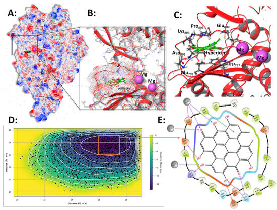Representation of important SARS-CoV-2 RdRp contacts with HY, obtained in simulation and metadynamics experiments. (A) General view of the RdRp-HY complex. (B) HY is inserted near the enzyme’s active site in a hydrophobic pocket. (C) Important residues contacting HY in simulation experiments. (D) Metadynamics results indicate a global energy minimum of −12.5 kcal/mol in the RdRp-HY complex. (E) Important interactions in the global minima complex obtained in metadynamics experiments converge to the same contact residues. Complex representations were obtained using Pymol version 2.3.0.