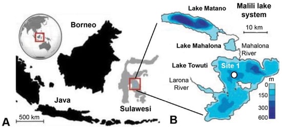 General overview of the sampling location modified from [43]. (A) Lake Towuti is situated on the Indonesian Island of Sulawesi and forms part of the Malili Lake system. (B) Bathymetry of Lake Mahalona and Lake Towuti, displaying the coring location of Site 1. The coring location (Site 1) is indicated by a black circle with white filling in panel (B).