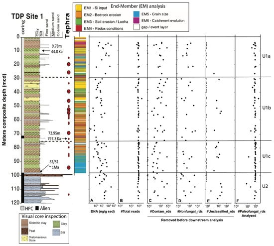 General overview of core 1F and the recovered sequence data. (A) Total extracted sedimentary DNA content (nanograms per gram of sediment). (B) Total number of reads, comprising (C) identified lab contaminants found in amplified and sequenced extractions and background blanks, either exclusively or in conjunction; (D) Non-fungal eukaryotes; (E) Unclassified reads; (F) Paleofungal reads utilized for downstream analysis in this study. All panels present quantities on a Log10 scale. The lithology graph on the left displays the meter composite depth (mcd), coring method (hydraulic piston vs Alien), the positions of tephra deposits T1-T23, and sediment ages. Radiocarbon dating of the bulk OM at 9.79 mcd revealed a sediment age of ~44.7 Ka, whereas 40Ar/39Ar dating of the tephra T18 layer at 72.95 mcd indicated a sediment age of 797.3 ± 1.6 Ka. The U2/U1c transition at ~98.8 mcd is estimated to have occurred 1 Ma ago through extrapolation (see the work of [40], for details). Also presented is a stratigraphic column illustrating previous endmember (EM) modelling of X-Ray Fluorescence (XRF) core-scanning data, modified based on the work of [44]). The column was generated by coloring each XRF data point according to its highest-scoring EM. The resulting six EMs (see the legend above the figure) represent changes in ecological (EM1), climatic (EM2-4), tectonic (EM5), and geomorphic processes that determine changes in sediment composition. Refer to [44], and the main text for further details.