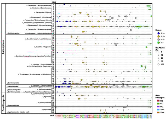 By way of another example, Myxotrichiaceae, related to Oidiodendron maius G.L. Barron (notably ASV40), revealed relatively high SIMPER associations with U2 silts and, to a lesser extent, felsic clays of U1. O. maius is widely distributed in temperate, subtropical, and tropical regions. Most often described as engaging in endomycorrhizal symbiosis with ericaceous plants, e.g., in [66], O. maius produces exoenzymes involved in the breakdown of complex and refractory plant biopolymers [67], and certain strains have also been isolated as saprobes from peatland, TOC-rich soils, and decaying plant litter [68]. The significant Spearman correlation with the small peatland-inhabiting trees of the family Rutaceae (Luvunga) suggests a role as wood-decomposing saprobes for the Oidiodendron-related fungi instead of an endomycorrhizal guild.